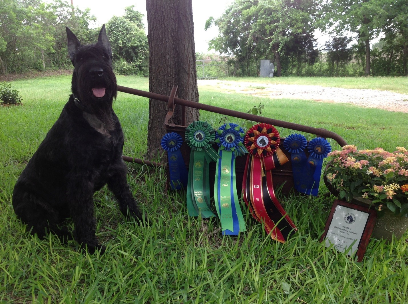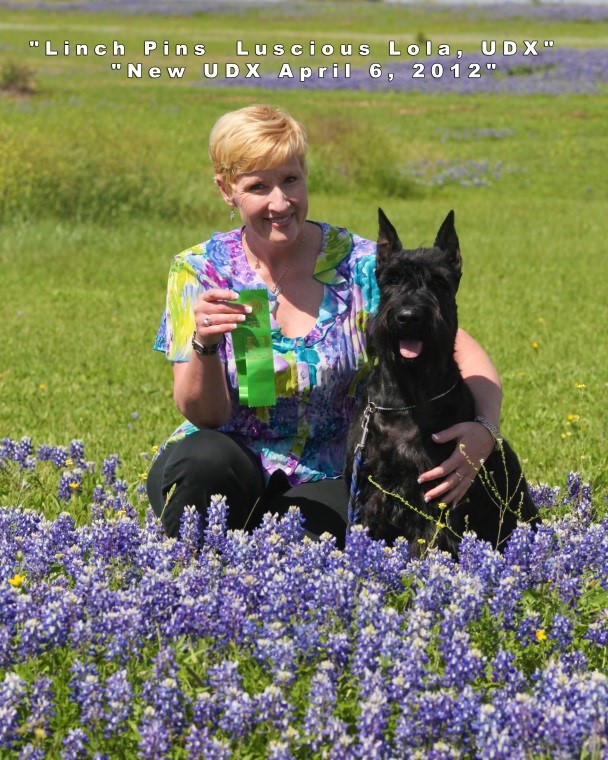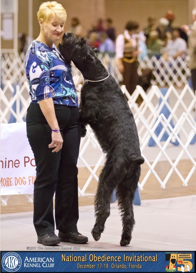 But Jennifer was off and going with her Giant, Lola. They flew through Novice and got their Open title with 3 first places. Onward to Utility. After working for a year and a half, they finally began showing in Utility. In 2010, Lola earned her Utility title with 3 first places. Onward to the UDX title. Jennifer received her UDX after a year of grueling showing. Lola was the Giant Schnauzer Club of America’s Obedience Giant of the Year in 2010 and again in 2012, and on the top 10 obedience Giants for 5 years. They won 3 High in Trials during their competitive career. Lola ended up with 20 OTCh points which may not be a lot to some but it was huge for them. Lola and Jennifer were invited to the AKC National Obedience Invitational (NOI) two times and were able to go in 2011. It was the experience of a lifetime and they ended up 9th in the working group. Lola and Jennifer traveled all over the country showing – it was the best time of her life.